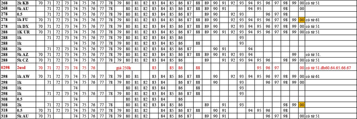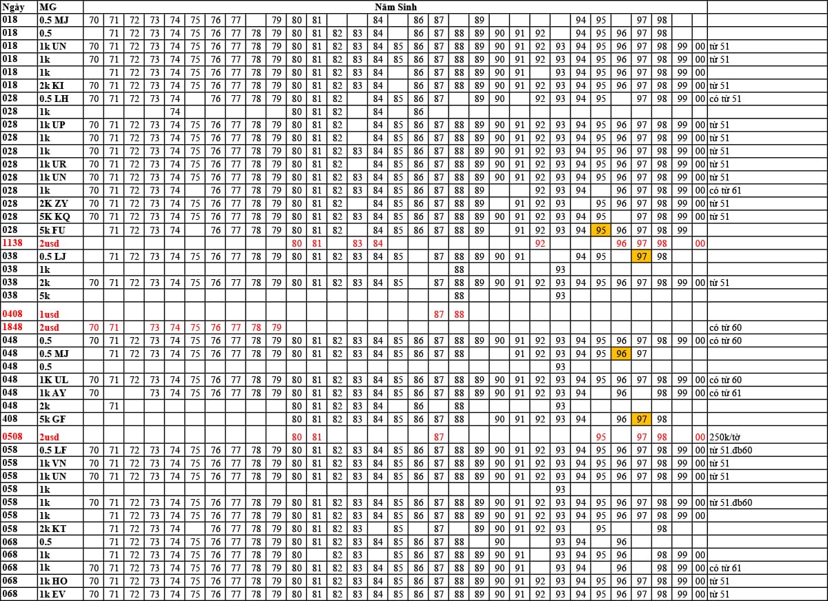 Cách thức tra cứu Tiền Năm Sinh: tìm kiếm theo ngày sinh ( dòng hàng ngang) sau đó tìm theo năm sinh theo các cột bên cạnh ( có hai bản năm 19xx và 20xx) để tìm được tiền năm sinh có số seri là ngày sinh nhật hoặc một ngày quan trọng của mình
